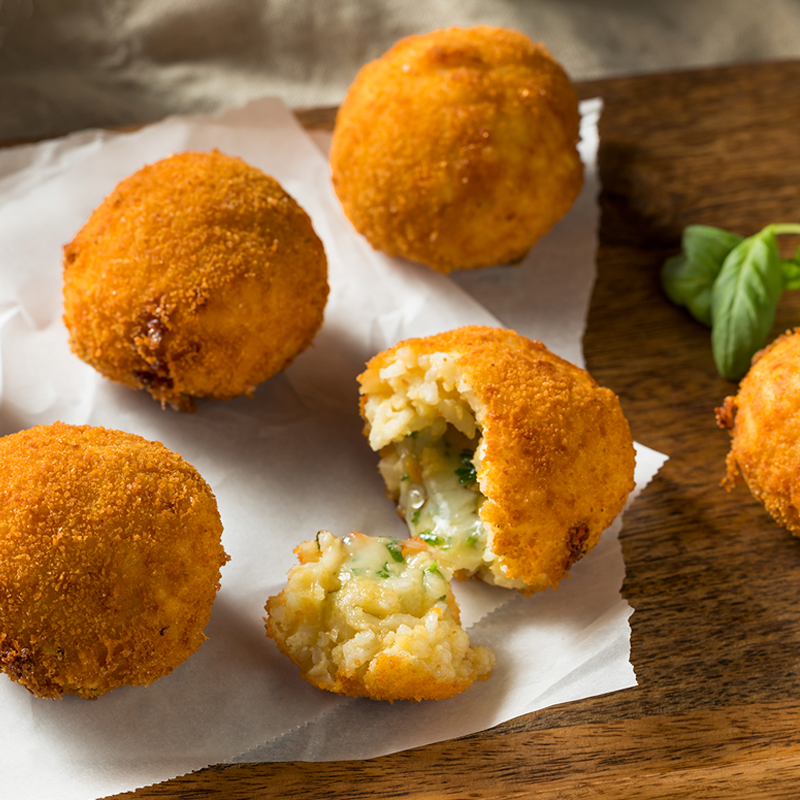 Disse delikate Arancini risottokugler består af afkølet, smagfuld risotto, formet til kugler omkring en cremet kerne af intens trøffelcreme, der tilfører retten en raffineret og dyb smagsoplevelse. Kuglerne paneres i rasp/panko rasp og friteres, indtil de opnår en sprød, gylden overflade med en blød og fyldig midte. Resultatet er en varm og uimodståelig appetitvækker, der vil vække begejstring.