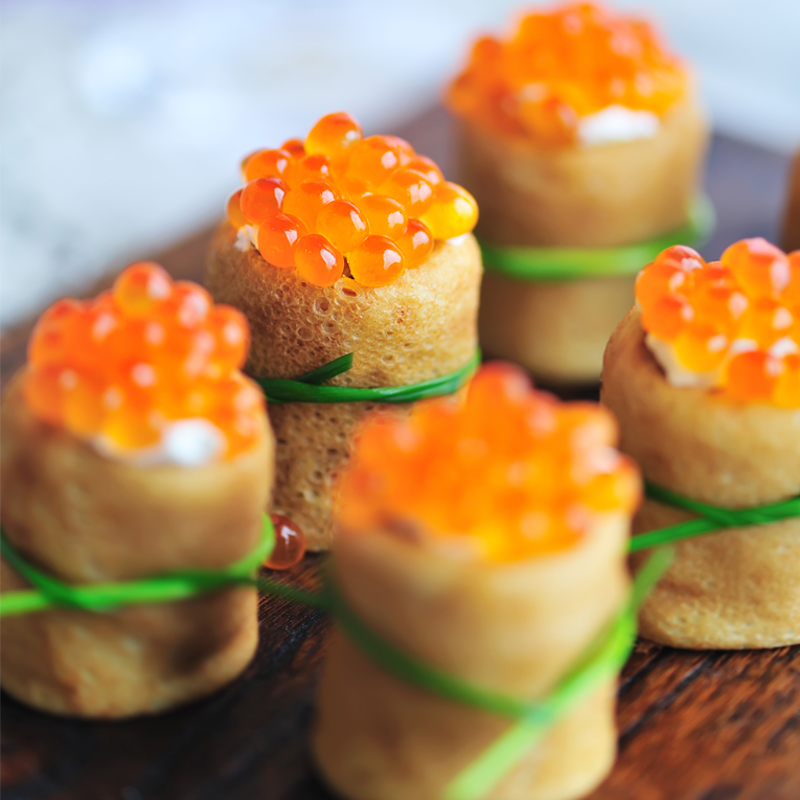 De elegante blinis ruller fyldes med en cremet, håndrørt krabbesalat med en let dressing af cremefraiche, citron og purløg. De bløde blinis danner en perfekt ramme for den delikate salat, mens et lille drys ekstra purløg giver friskhed. Til sidst toppes hver blinis med et generøst skefuld rogn, som tilfører et raffineret saltet modspil.