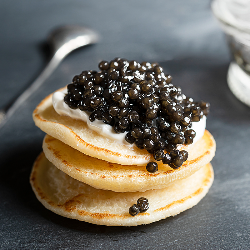 Små, sprøde blinis eller tynde toastskiver serveres med en let smørret base eller en mild cremefraiche, der fremhæver kaviarens delikate smag. Et lille skefuld kaviar på toppen giver en luksuriøs, saltet note og et festligt udtryk.