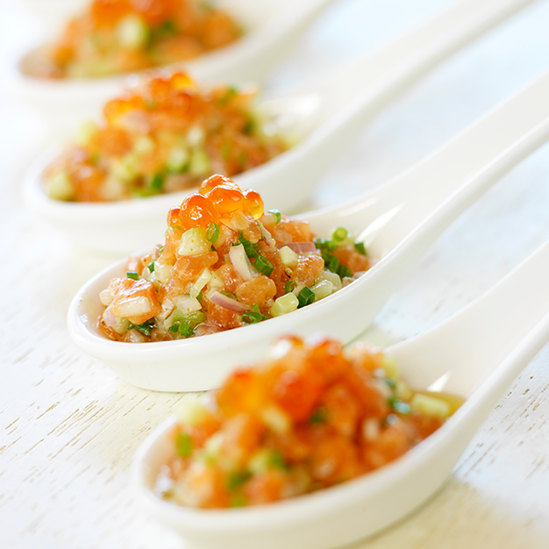 Frisk, fintskåret laks skåret i små tern, vendt med citronskal, en anelse skalotteløg, agurker i tern og purløg. Portionsanret på små skeer eller skåle med de sprøde, tynde og knasende rugbrødschips ved siden af – et rustisk og velsmagende akkompagnement til det bløde laksefyld. Her får du en raffineret appetizer med nordisk præg og en harmonisk balance mellem sprødhed, friskhed og fylde.