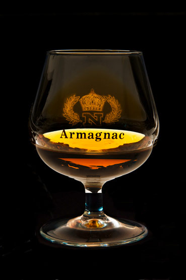 Armagnac har hjemme i Gascogne i Sydvestfrankrig. Omkring 10 druetyper er tilladt, men i praksis er det, ligesom cognac, hovedsageligt Ugni Blanc, Folle Blance og Colombard, basisvinen laves på; plus den meget lokale Baco: En hybrid mellem Folle Blanche og den amerikanske Noah, oprindeligt skabt til at være resistent mod vinlusen. Druerne høstes ret tidligt, med en potentiel alkoholprocent på 9-10, for at bevare en frisk syre.